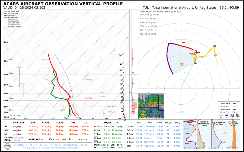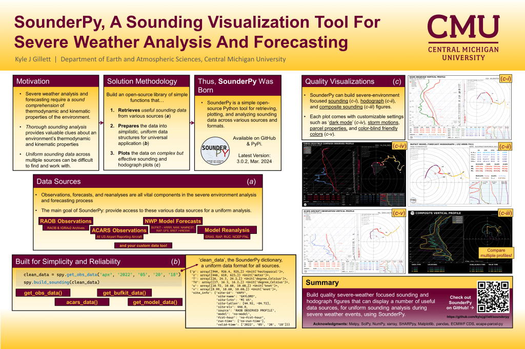 ABSTRACT: SounderPy is a simple, open-source Python package for retrieving and plotting vertical profile (sounding) data. Built for simplicity and reliability for all uses and users, this project’s goal is to provide a uniform method for sounding analysis across multiple data types. Severe weather analysis and forecasting requires a sound comprehension of thermodynamic and kinematic properties of the environment. SounderPy makes this possible with robust access to data and custom visualizations. The tool creates complex yet effectivesounding and hodograph plots with high readability which are designed specifically for severe weather analysis and forecasting. SounderPy is capable of retrieving and plotting model forecast data, observed radiosonde data, Aircraft Communications Addressing and Reporting System (ACARS) observation data, and model reanalysis data. All of this functionality can be completed in three simple lines of code or less, making SounderPy an accessible tool for both Python experts and novices. A number of scientific Python libraries build the base of SounderPy’s efficient and durable functionality, such as NumPy, Matplotlib, xarray, Metpy, and SHARPpy. SounderPy is available through GitHub and PyPi and is distributed under an MIT license.